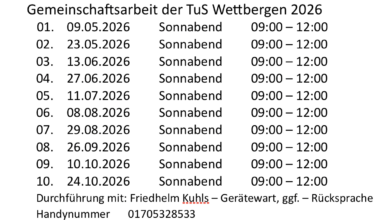 Gemeinschaftsarbeit 2026 01. 09.05.2026 Sonnabend 09:00 – 12:00 02. 23.05.2026 Sonnabend 09:00 – 12:00 03. 13.06.2026 Sonnabend 09:00 – 12:00…